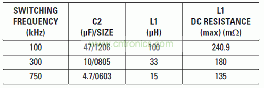 本例中,我們可以通過(guò)750-kHz開(kāi)關(guān)頻率來(lái)產(chǎn)生一個(gè)5-V輸出電壓(參見(jiàn)表2)。但是,如果該頻率為1 MHz,則最低可能輸出電壓被限制為約6V;否則,DC/DC轉(zhuǎn)換器會(huì)跳過(guò)脈沖。替代方法是降低輸入電壓或者頻率。在選擇某個(gè)開(kāi)關(guān)頻率以前,你最好是先查看DC/DC轉(zhuǎn)換器數(shù)據(jù)表,了解保證最小可控“導(dǎo)通”時(shí)間。