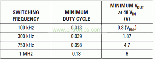 最小可控“導(dǎo)通”時(shí)間限制是DC/DC轉(zhuǎn)換器IC的一個(gè)特點(diǎn),其為脈寬調(diào)制(PWM)電路的最窄可達(dá)脈寬。在降壓轉(zhuǎn)換器中,開(kāi)關(guān)周期期間功率MOSFET導(dǎo)通的時(shí)間百分比被稱作占空比,其等于輸出電壓與輸入電壓的比。使用TPS54160轉(zhuǎn)換器時(shí),占空比為0.104(4 V/48 V),而數(shù)據(jù)表中列出的最小“導(dǎo)通”時(shí)間為130 ns??煽孛}寬限制產(chǎn)生一個(gè)最小可達(dá)占空比,而用最小“導(dǎo)通”時(shí)間乘以開(kāi)關(guān)頻率,我們可以輕松地計(jì)算出該占空比的大小。一旦知道了最小占空比,利用VIN乘以最小占空比,我們便可以計(jì)算出最低可達(dá)輸出電壓。最低輸出電壓同樣也受轉(zhuǎn)換器基準(zhǔn)電壓的限制,使用TPS54160時(shí)其為0.8V。