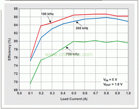 三個(gè)例子的重要損耗組成部分,來(lái)自于FET驅(qū)動(dòng)損耗、FET開(kāi)關(guān)損耗和電感損耗。FET電阻和IC損耗是一致的,因?yàn)樗腥齻€(gè)設(shè)計(jì)中都使用了相同的IC。由于所有例子中都選擇了低ESR的陶瓷電容,因此電容損耗可以忽略不計(jì)。為了表明高頻開(kāi)關(guān)的影響,我們對(duì)每個(gè)例子的效率都進(jìn)行了測(cè)量,并將其顯示在圖2中。該圖清楚地表明,效率隨開(kāi)關(guān)頻率增加而下降。若想提高所有頻率下的效率,需要尋找到一種全負(fù)載狀態(tài)下低漏到源“導(dǎo)通”電阻、低門(mén)電荷或者低靜態(tài)電流規(guī)范的DC/DC轉(zhuǎn)換器;或者尋找到一些具有更低等效電阻的電容和電感。