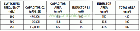 表4列出了三種設(shè)計(jì)要求的總電路板面積,以及電容和電感的焊盤(pán)面積。電容或者電感的建議焊盤(pán)面積,稍稍大于單個(gè)組件本身,且三種設(shè)計(jì)舉例均使用了該面積。每個(gè)組件占用的面積相加(其包括IC、濾波器以及所有其它小型電阻器和電容的焊盤(pán)尺寸),然后將得到的結(jié)果乘以2倍(考慮到組件的間距),便得到總面積。100-kHz和750-kHz設(shè)計(jì)之間存在近250 mm2的總面積節(jié)省,從而使濾波器體積縮小50%,而板空間占用減少55%。但是,存在收益遞減規(guī)律,因?yàn)殡娙莺碗姼兄禑o(wú)法減少至零!換句話說(shuō),不斷推高頻率并不能夠一直減小總尺寸,因?yàn)槟銦o(wú)法總是能夠在市場(chǎng)上買(mǎi)到這些尺寸適合且批量生產(chǎn)的電感和電容。注意,33-µH和15-µH電感占用相同的面積。存在這種可能性,是因?yàn)?3-µH電感的高度為3.5 mm,而15-µH電感僅高2.4 mm。我們想通過(guò)這兩種電感來(lái)說(shuō)明的觀點(diǎn)是:電感與體積成正比例關(guān)系。