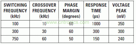 瞬態(tài)響應(yīng)是電源性能級(jí)別的一個(gè)較好指標(biāo)。我們利用每種電源的波特圖來(lái)表明高開(kāi)關(guān)頻率的對(duì)比情況(參見(jiàn)圖3)。如圖所示,每個(gè)電源的相位裕度在45°和55°之間,其表明瞬態(tài)響應(yīng)得到較好的抑制。交叉頻率約為開(kāi)關(guān)頻率的1/8。使用快速開(kāi)關(guān)DC/DC轉(zhuǎn)換器時(shí),設(shè)計(jì)人員應(yīng)確保電源IC誤差放大器具有足夠的帶寬來(lái)支持高交叉頻率。TPS54160誤差放大器的單位增益頻寬一般為2.7 MHz。表5顯示了實(shí)際瞬態(tài)響應(yīng)時(shí)間以及電壓峰值過(guò)沖的相關(guān)值。開(kāi)關(guān)頻率越高,過(guò)沖值便越是更低,原因是更寬的帶寬。