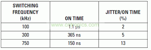 高轉(zhuǎn)換比和更高頻率時(shí),會(huì)存在噪聲問(wèn)題。當(dāng)選擇某個(gè)高開(kāi)關(guān)頻率時(shí),設(shè)計(jì)人員應(yīng)考慮抖動(dòng)和DC/DC轉(zhuǎn)換器的最小“導(dǎo)通”時(shí)間。當(dāng)占空比較小時(shí),抖動(dòng)噪聲便為開(kāi)關(guān)脈沖的更大百分比。表6顯示了48-V到5-V轉(zhuǎn)換比時(shí),抖動(dòng)與“導(dǎo)通”時(shí)間之比。我們假設(shè),在該相位節(jié)點(diǎn)上存在0.5-V二極管壓降和20-ns抖動(dòng)。