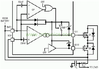 每條電源通路都由兩個背對背的PFET組成,這兩個PFET與短路檢測電阻RSC串聯(lián)。電池電源通路(PowerPathTM)開關驅動器等效電路如圖 5 所示。