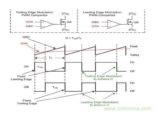 前沿調(diào)制脈寬調(diào)制稍微不同于后沿調(diào)制。OSC信號饋送至非反相脈寬調(diào)制比較器輸入,而誤差電壓則饋送給反相引腳。FET (QB) 關(guān)閉與OSC峰值電壓和前沿同步,當FET導(dǎo)通時對前沿進行調(diào)制以達到占空比(請參見圖 2)。