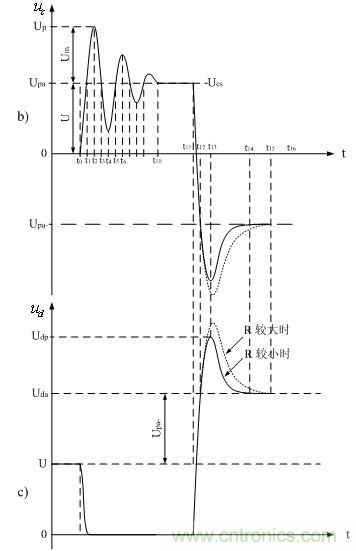 到t4時(shí)刻之后,輸入電壓ui對(duì)分布電感Ls和分布電容Cs進(jìn)行充電的過程,以及分布電感Ls和分布電容Cs互相進(jìn)行充電的過程,與t0~t4時(shí)刻基本相同。但由于在此期間,輸入電壓的上升率等于0,輸入電壓不再向分布電感Ls和分布電容Cs提供能量,因此,分布電感Ls與分布電容Cs產(chǎn)生自由振蕩的幅度是隨著時(shí)間衰減的,其衰減速率與等效電阻大小有關(guān)。