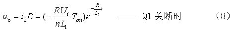 (8)式中,L1、L2分別為開關(guān)變壓器初、次級(jí)線圈的電感,n為開關(guān)變壓器線圈的匝數(shù)比,n=N2/N1,Ui為變壓器初級(jí)線圈的輸入電壓,Ton為開關(guān)管的導(dǎo)通時(shí)間,R為等效負(fù)載電阻。
