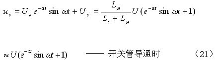 (21)式是當(dāng)電源開關(guān)管Q1導(dǎo)通時,分布電容Cs兩端電壓隨時間變化的表達式,它由兩部分電壓組成,一部分是電容Cs兩端電壓的半波平均值,由(19)式表示;另一部分是正弦阻尼振蕩,其最大振幅等于