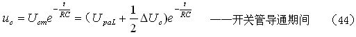 從(35)式可以看出,開(kāi)關(guān)管每關(guān)斷一次,電容器C兩端的電壓就要增加一個(gè)電壓增量;為了不讓電容器C兩端的電壓不斷增加,必須要在開(kāi)關(guān)管導(dǎo)通期間,把電容器C每次充電新增的電荷通過(guò)R釋放掉;即,在開(kāi)關(guān)管每次關(guān)斷之前,電容器C兩端的電壓都要通過(guò)電阻R釋放掉一部分,使下降的電壓正好與電容器C充電時(shí)新增的電壓