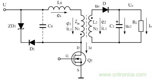 與開關(guān)變壓器初級線圈的電感L的比值K為5%,根據(jù)(42)式可求勵磁電感產(chǎn)生的反擊輸出電壓