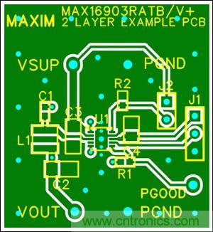 針對(duì)開關(guān)穩(wěn)壓器MAX16903(圖9)外圍元件的合理布局,有助于從源頭降低噪聲和電磁輻射,有助于節(jié)約項(xiàng)目評(píng)估階段的寶貴時(shí)間,簡(jiǎn)化設(shè)計(jì)。