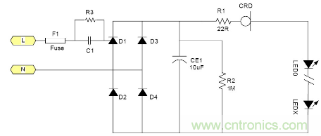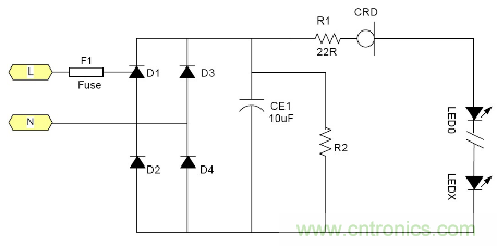 由于恒流二極管需要一定的電壓Vk才能夠進入恒流, 所以太低的電源電壓是無法工作的。通常這個Vk大約在5-10V左右 所以大多數(shù)采用電池供電的LED是無法工作的, 最大電流由于恒流二極管的功耗受到限制, 所以過大的電流也是不合適的。例如1W的LED通常需要350mA, 恒流二極管就很難提供, 目前比較合適的使用場合就是交流市電供電的LED燈具采用很多小功率LED串聯(lián)也就是高壓小電流的情況是最為合適;但是由于恒流二極管的耐壓有一定的限制 所以它所能吸收的電源電壓變化也是有限的。就拿100V耐壓的CRD來說用在220V市電電源里都還只能對付有限的電壓變化。220V經(jīng)過橋式整流以后它的輸出直流電壓大約為264V.如果市電變化+10% ~-15%就相當于整流后為290~187V, 電壓變化103V.已經(jīng)超過其耐壓了。因為LED伏安特性的非線性 所以很難用公式來表示??傊斒须婋妷航档蜁rLED中的電流就會隨市電電壓的降低而降低。其亮度也會跟著變。 典型應(yīng)用電路中圖3為典型的應(yīng)用電路, 圖4為加了阻容降壓的應(yīng)用電路為了應(yīng)對低電壓的輸出場合。