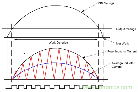 在半個輸入電壓周期內(nèi), 控制TON固定, 則電感電流峰值跟隨輸入電壓峰值, 且相位相同, 實現(xiàn)高功率因素PF, 有如下等式: