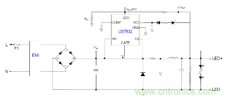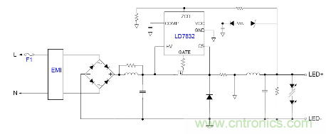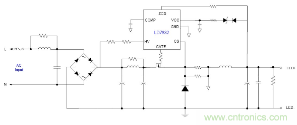 隨著目前法規(guī)和能效的需求, 針對LED應(yīng)用提出高PF以及適應(yīng)全電壓范圍都能可靠工作的要求, 并且朝小型化方面發(fā)展, 因此之前的填谷式的PFC電路也需要增加兩個高壓電容因體積的限制不太適合應(yīng)用。有鑒如此, 國內(nèi)外很多廠商都推出了適應(yīng)球泡燈和T管之類的非隔離電源應(yīng)用驅(qū)動方案, 下面就以通嘉科技的LD7832做為典型介紹。