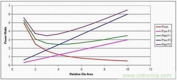 但是,在更高的工作頻率下,最佳裸片面積較小,從而帶來(lái)成本節(jié)約。實(shí)際上,在低頻率下,通過(guò)調(diào)整裸片面積來(lái)最小化損耗會(huì)帶來(lái)極高成本的設(shè)計(jì)。但是,轉(zhuǎn)到更高工作頻率后,我們就可以?xún)?yōu)化裸片面積來(lái)降低損耗,從而縮小電源的半導(dǎo)體體積。這樣做的缺點(diǎn)是,如果我們不改進(jìn)半導(dǎo)體技術(shù),那么電源效率將會(huì)降低。