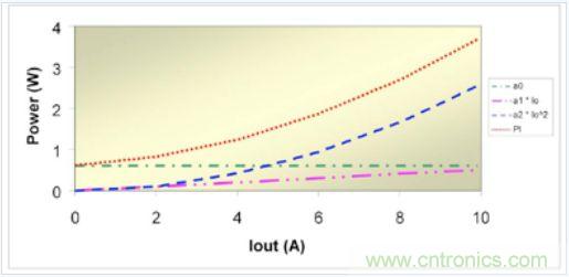 如果意識到電源損耗與輸出電流相關(可用輸出電流替換 X),那么系數(shù)項就能很好地與不同來源的電源功率損耗聯(lián)系起來。例如,ao 代表諸如柵極驅動、偏壓電源和磁芯的固定開銷損耗以及功率晶體管 Coss 充電與放電之類的損耗。這些損耗與輸出電流無關。第二項相關聯(lián)的損耗 a1 直接與輸出電流相關,其典型表現(xiàn)為輸出二極管損耗和開關損耗。在輸出二極管中,大多數(shù)損耗是由于結電壓引起的,因此損耗會隨著輸出電流成比例地增加。