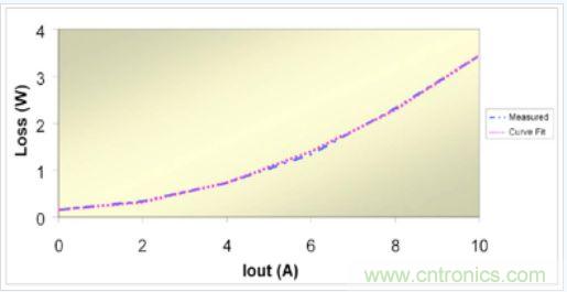 實際損耗與三項式之間的相關性非常好。圖 2 對同步降壓穩(wěn)壓器的測量數(shù)據(jù)與曲線擬合數(shù)據(jù)進行了對比。我們知道,在基于求解三個聯(lián)立方程組的曲線上將存在三個重合點。對于曲線的剩余部分,兩個曲線之間的差異小于2%。由于工作模式(如連續(xù)或非連續(xù))不同、脈沖跳頻或變頻運行等原因,其他類型的電源可能很難以如此匹配。這種方法并非絕對可靠,但是有助于電源設計人員理解實際電路損耗情況。