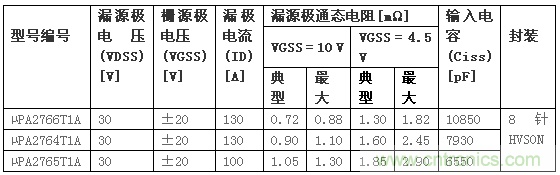 為了滿足這種需要,瑞薩電子在本公司新型低通態(tài)電阻工藝的基礎(chǔ)上,研發(fā)了一套(三件)MOSFET產(chǎn)品。新型µPA2764T1A、µPA2765T1A 和 µPA2766T1A能夠滿足上述需要,能以更小的規(guī)格提供行業(yè)領(lǐng)先的電源裝置內(nèi)的低通態(tài)電阻。