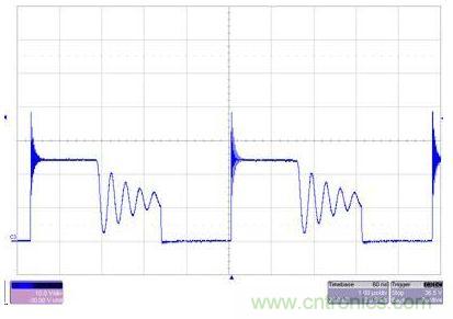 圖2 SEPIC極大地降低了EMI和電壓應(yīng)力。上圖沒有C1,而下圖則安裝了C1。