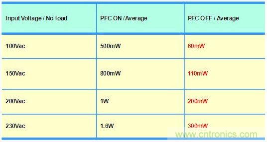 為了評(píng)測(cè)PFC級(jí)的間歇工作,使用FAN7930臨界導(dǎo)通模式PFC控制器、帶間歇工作功能的 準(zhǔn)諧振反激控制器FAN6300A以及所提議的PFC控制電路,設(shè)計(jì)了一個(gè)用于LED街燈的的120W(48V/2.5A) LEB-016演示線路板。如圖2所示,建議的電路工作出色。表1所示為在各種輸入線路電壓下的待機(jī)功耗測(cè)量值。可以證明:在寬泛的輸入范圍內(nèi),可以使待 機(jī)功耗降低80%以上。還可以在高線路輸入電壓下獲得低于0.3W的待機(jī)功耗。