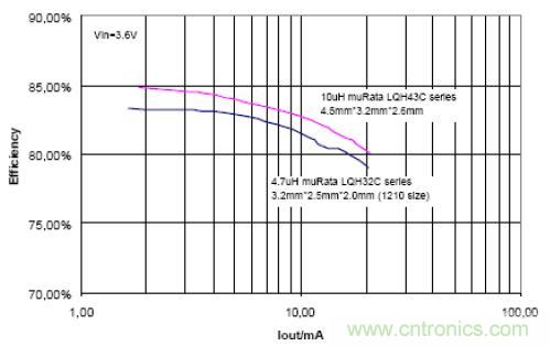 圖 10 顯示整個鋰離子電池電壓范圍(2.7V~4.2V)內(nèi)均可以實現(xiàn) 80% 以上的效率。在此應用中,使用了一個高度僅為 1.2mm 的電感 (Sumida CMD4D11-4R7, 3.5mm*5.3mm*1.2mm)。 從圖 10 中的效率曲線可以看出:在大多數(shù)應用中,升壓轉(zhuǎn)換器可以實現(xiàn)比充電泵解決方案更高的效率。但是,在無線應用中使用升壓轉(zhuǎn)換器或充電泵時還需要考慮 EMI 問題。