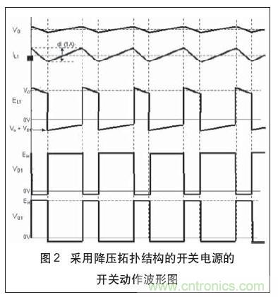 在達(dá)到預(yù)定的電壓或電流限值時,控制集成電路將開關(guān)斷開,從而使電感周圍的磁場衰減,并使偏置二極管D1正向?qū)ǎ瑥亩^續(xù)向輸出電路供給電流,直至開關(guān)再度接通。這一循環(huán)反復(fù)進行,而開關(guān)的次數(shù)由控制集成電路來確定,并將輸出電壓調(diào)控在要求的電壓值上。圖2所示為在若干個開關(guān)循環(huán)周期內(nèi),流過電感器和其它降壓拓?fù)潆娐吩系碾妷汉碗娏鞑ㄐ巍?/p>
