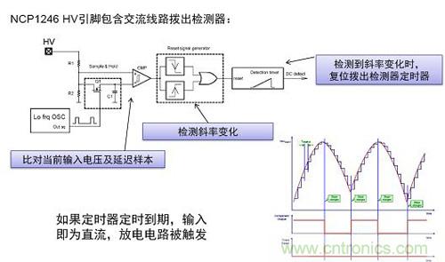 為了符合安規(guī)標準,AC-DC電源必須具備在撥出交流插頭后不到1秒時間內將電磁干擾(EMI)濾波器X2輸入電容放電的能力。為了符合此要求,常使用與電容并聯(lián)的一串高阻抗電阻,但是,電阻型消耗源 (drain)消耗約25 mW輸入能耗,當考慮到空載輸入能耗時,此25 mW能耗相對較大。安森美半導體的方案采用有源X2電容放電來檢測斷開交流連接狀況,并通過開關觸發(fā)電容放電。NCP1246 HV引腳包含了交流線路撥出檢測器,如果定時器定時到期,輸入即為直流,放電電路被觸發(fā),X2電容放電,見圖2。