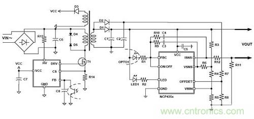 NCP4354是專為與NCP1246配合使用而設計的一款低待機能耗次級端恒流恒壓 (CCCV) 控制器,帶有LED驅動器 (圖3)。其價值在于,可檢測空載條件并使主控制器進入超低頻率跳周期模式,以降低待機功耗;只有一個反饋和關閉(OFF)控制所需的光耦;提高了空載效率(小于15 mW);元件更少。此外,它還具有CCCV反饋和LED驅動器、供電電壓高達36 V、在關機模式可調整最低Vout、1.25 V參考精度為1%,以及Icc大于100 μA等特性。NCP4354與NCP1246一起使用,可調節(jié)Vmin,市場及應用范圍包括筆記本電腦適配器及其他外部電源適配器。NCP435x系列還有一款不帶LED驅動器的產(chǎn)品NCP4353,可以與NCP1246一起使用來調節(jié)Vmin(僅B版本)。