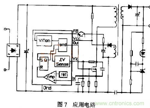 由(9),(10)或可知,調(diào)節(jié)輸出功率、穩(wěn)定輸出電壓可以調(diào)節(jié)導(dǎo)通時(shí)間或占空比或調(diào)頻方式或幾種方式綜合應(yīng)用。當(dāng)輸出功率下降或電源電壓上升,導(dǎo)通時(shí)間減小,反之導(dǎo)通時(shí)間增加;隨輸出功率的增加或減小變壓器初次級電流峰值均增加或減小,由式(3)可知變壓器的釋放儲(chǔ)能時(shí)間也隨之增加或減少,為實(shí)現(xiàn)“零電壓”開關(guān),變壓器不能工作在間歇狀態(tài),因此F%IM控制方式不能滿足本文電路的“零電壓”開通的要求?;谏鲜龉ぷ鳁l件的約束,本文電路應(yīng)采用輸出電壓反饋控制導(dǎo)通時(shí)間,用“零電壓”檢測控制開關(guān)管導(dǎo)通時(shí)刻,即調(diào)頻、調(diào)占空比工作方式。具體電路可以采用通用器件組合,如圖7。