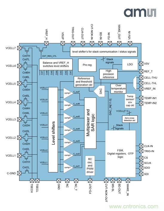 AS8506具有先進(jìn)的模擬電路,相當(dāng)于最高七塊電池的電壓,且內(nèi)外參數(shù)的精確度可達(dá)到1mV。同時(shí),該設(shè)備具有上下可調(diào)節(jié)的內(nèi)外電池電壓限額。電池電壓還能實(shí)現(xiàn)數(shù)字化,精確度可達(dá)5mV,并能向主控制器發(fā)送報(bào)告。AS8506可自動(dòng)進(jìn)行主動(dòng)和被動(dòng)的電量均衡,或者通過(guò)SPI接口進(jìn)行電量控制。主動(dòng)電池電量均衡只需要一個(gè)額外的回掃變壓器。AS8506中已經(jīng)集成了控制電路,通過(guò)兩個(gè)外部熱敏電阻(NTC)傳感器就能實(shí)現(xiàn)溫度測(cè)量。