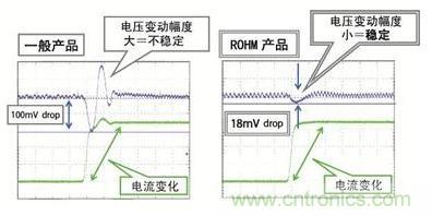 參見表1?;旧?,兩種產(chǎn)品都是高效同步整流的降壓型控制器,不僅在重負(fù)載時(shí)的效率高,輕負(fù)載時(shí)的效率也很高。標(biāo)準(zhǔn)電壓為0.75V/0.7V,適用低電壓,±1%的精度對(duì)于前述的±3%的精度來說具有充分的余量。不僅如此,通過ROHM獨(dú)創(chuàng)的H3RegTM控制模式實(shí)現(xiàn)了高速負(fù)載瞬態(tài)響應(yīng)(圖4),非常適合用作FPGA電源。