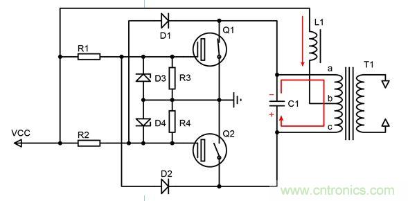 6. (t2時間)C1放電完畢,T1繞組由c到a電流達到最大值,將像C 1充電,使C1充電為a正c負的電壓,同時C1兩端電壓正弦變大。此時兩個MOS管同時進入放大區(qū)。