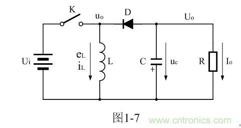 圖1-7中,Ui為輸入電源,K為控制開關(guān),L為儲(chǔ)能電感,D為整流二極管,C為儲(chǔ)能濾波電容,R為負(fù)載電阻。當(dāng)控制開關(guān)K接通的時(shí)候,輸入電源Ui開始對(duì)儲(chǔ)能電感L加電,流過儲(chǔ)能電感L的電流開始增加,同時(shí)電流在儲(chǔ)能電感中也要產(chǎn)生磁場;當(dāng)控制開關(guān)K由接通轉(zhuǎn)為關(guān)斷的時(shí)候,儲(chǔ)能電感會(huì)產(chǎn)生反電動(dòng)勢,使電流繼續(xù)流動(dòng),并通過整流二極管D進(jìn)行整流,再經(jīng)電容儲(chǔ)能濾波,然后向負(fù)載R提供電流輸出。控制開關(guān)K不斷地反復(fù)接通和關(guān)斷過程,在負(fù)載R上就可以得到一個(gè)負(fù)極性的電壓輸出。