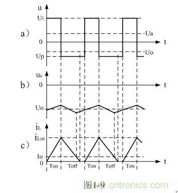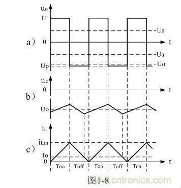 圖1-8、圖1-9、圖1-10分別是控制開關(guān)K的占空比D等于0.5、< 0.5、> 0.5時(shí),圖1-7電路中幾個(gè)關(guān)鍵點(diǎn)的電壓和電流波形。圖1-8-a)、圖1-9-a)、圖1-10-a)分別為控制開關(guān)K輸出電壓uo的波形;圖1-8-b)、圖1-9-b)、圖1-10-b)分別為儲(chǔ)能濾波電容兩端電壓uc的波形;圖1-8-c)、圖1-9-c)、圖1-10-c)分別為流過儲(chǔ)能電感L電流iL的波形。應(yīng)該特別注意的是,圖1-8-c)、圖1-9-c)、圖1-10-c)中的電流波形按原理應(yīng)該取負(fù)值,但取負(fù)值后反而覺得與前面圖1-5與圖1-6不好對(duì)比和分析,因此,當(dāng)進(jìn)行具體計(jì)算時(shí),一定要注意電流和電壓的方向。
