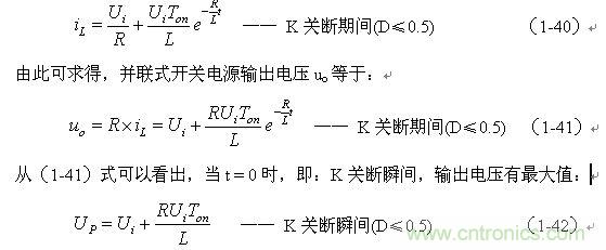 式中C為待定常數(shù),把初始條件(令t = 0)代入上式,很容易就可求出C。由于控制開關(guān)K由接通狀態(tài)突然轉(zhuǎn)為關(guān)斷時(shí),流過儲(chǔ)能電感L中的電流iL不能突變,即i(Ton+) = i(Toff—),并且正好等于流過儲(chǔ)能電感L的最大電流ILm ,因此(1-39)式可以寫為: