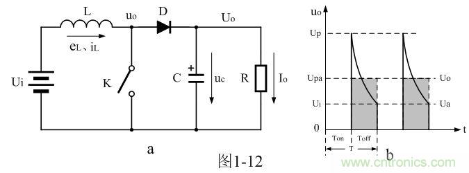 在圖1-12-a中,當(dāng)控制開關(guān)K接通時(shí),輸入電源Ui開始對(duì)儲(chǔ)能電感L加電,流過儲(chǔ)能電感L的電流iL開始增加,同時(shí)電流在儲(chǔ)能電感L中也要產(chǎn)生反電動(dòng)勢(shì)eL;當(dāng)控制開關(guān)K由接通轉(zhuǎn)為關(guān)斷的時(shí)候,在儲(chǔ)能電感L兩端就會(huì)產(chǎn)生反電動(dòng)勢(shì)eL。eL反電動(dòng)勢(shì)的方向與開關(guān)K關(guān)斷前的方向相反,但與電流的方向相同,因此,在控制開關(guān)K兩端的輸出電壓uo等于輸入電壓Ui與反電動(dòng)勢(shì)eL之和。