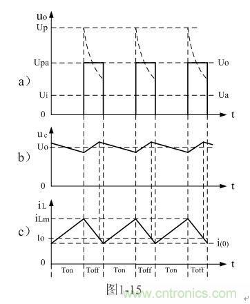 從圖1-13可以看出,并聯(lián)式開關(guān)電源,流過負(fù)載的電流比串聯(lián)式開關(guān)電源流過負(fù)載的電流小一倍,流過負(fù)載的電流Io只有流過儲(chǔ)能電感最大電流iLm的四分之一。在占空比D等于0.5的情況下,電容器充電的時(shí)間為