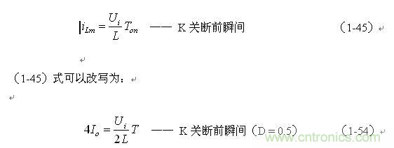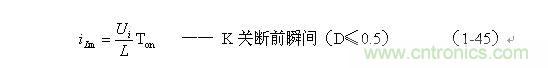 (1-44)式中iL為流過儲(chǔ)能電感L的電流(瞬時(shí)值),t為時(shí)間變量;i(0)為的初始電流,即:控制開關(guān)K接通前的瞬間流過儲(chǔ)能電感L中的電流。當(dāng)開關(guān)電源工作于電流臨界連續(xù)狀態(tài),或不連續(xù)電流狀態(tài)時(shí)(即D≤0.5),i(0) = 0 ,由此可以求得流過儲(chǔ)能電感L的最大電流為:
