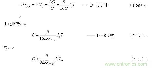 (1-59)和(1-60)式,就是計(jì)算并聯(lián)式開關(guān)電源儲(chǔ)能濾波電容的公式。式中:Io是流過負(fù)載電流的平均值,T為開關(guān)工作周期,ΔUP-P為濾波輸出電壓紋波,此紋波電壓ΔUP-P實(shí)際上就是電容器兩端的充放電電壓增量,即:ΔUP-P = ΔUc 。