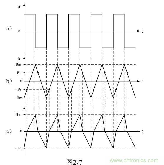 圖2-7是多個交流脈沖電壓連續(xù)加到變壓器初級線圈a、b兩端時,輸入脈沖電壓與變壓器鐵芯中磁感應強度B或磁通