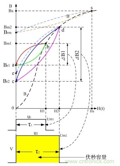 圖9是開關(guān)變壓器伏秒容量與磁場(chǎng)強(qiáng)度H、磁感應(yīng)強(qiáng)度B的對(duì)應(yīng)關(guān)系圖。圖中,脈沖幅度V總是與磁感應(yīng)強(qiáng)度的增量成正比;而脈沖寬度τ總是與磁場(chǎng)強(qiáng)度H成正比,也與勵(lì)磁電流