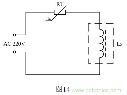 開關(guān)變壓器退磁的最好的方法是讓開關(guān)變壓器初級(jí)線圈在非常短的時(shí)間內(nèi)通過(guò)一個(gè)幅度為3~5倍Imax(極限電流)的阻尼振蕩電流。因此,可用一個(gè)20~40歐姆的消磁熱敏電阻(可用兩個(gè)消磁熱敏電阻串聯(lián))與開關(guān)變壓器的初級(jí)線圈串聯(lián),然后接到110~220V/50Hz交流電源上,大約只需要20多秒鐘,待消磁熱敏電阻完全加熱后,即可達(dá)到退磁的目的,如圖14所示。在圖14中,RT為熱敏電阻,Lx為開關(guān)變壓器的初級(jí)線圈。