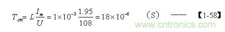 當(dāng)占空比等于0.5時(shí),對(duì)應(yīng)的輸入電壓U為108V,對(duì)應(yīng)的最大電流Im為1.95A,假設(shè)開(kāi)關(guān)變壓器初級(jí)線圈的電感量L=1000uH,根據(jù)【1-45】式,可求得Ton的值為: