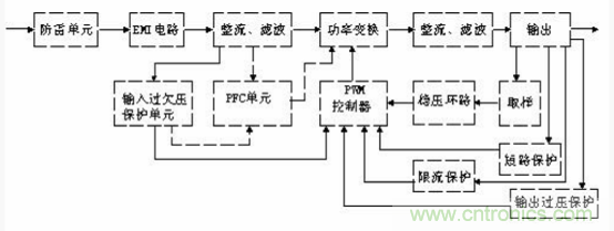 開關(guān)電源的主要電路是由輸入電磁干擾濾波器(EMI)、整流濾波電路、功率變換電路、PWM 控制器電路、輸出整流濾波電路組成。輔助電路有輸入過欠壓保護電路、輸出過欠壓保護電路、輸出過流保護電路、輸出短路保護電路等。