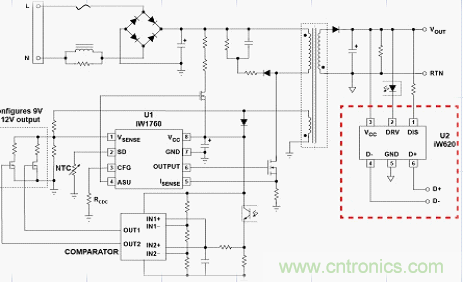 圖8 為基于Dialog 公司2014年初推出的iw620+iw1760的快速充電設(shè)計方案實物圖,電路的設(shè)計思路為iW620快速充電接口IC可以通過USB數(shù)據(jù)線檢測到支持Quick Charge 2.0的移動設(shè)備發(fā)出的指令,然后與iW1760 PWM原邊控制器進行通信,對電源適配器輸出電壓進行配置。位于初級側(cè)的iW1760就可提供電流感應(yīng)。通過其可編程的主動快速放電專利技術(shù)能將輸出電壓從9V或12V降至5V, 因此,當(dāng)用 戶拔掉連接Quick Charge 2.0手機的USB數(shù)據(jù)線,再將其連接至非Quick Charge 2.0手機時,iW620可以迅速把輸出電壓降至5V,避免對其造成損壞。