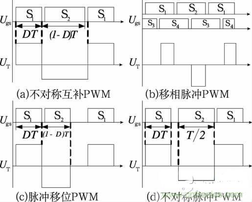 控制型軟開關半橋DC/DC變換器不增加主電路元器件(可增加電感電容元件以實現(xiàn)軟開關條件),通過合理設計控制電路來實現(xiàn)軟開關。圖1給出4種控制型軟開關半橋DC/DC變換器的PWM控制策略。
