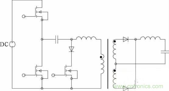 不對稱脈沖PWM 控制,其下管下降沿與上管的前沿互補,上管可實現(xiàn)ZVS。只要設計的占空比較小,無需其它措施即使工作在較高頻率下開關損耗也很小。變壓器直流偏磁,除占空比端點外,偏磁電流小于不對稱半橋。寬范圍適用性優(yōu)于傳統(tǒng)的不對稱半橋。低壓大電流的應用場合有一定的優(yōu)勢。