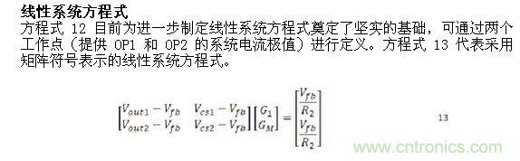Vcs1 和 Vcs2 可通過方程式 4 確定。請選擇 R2 的值。最佳實踐是選擇已經(jīng)存在于電源設(shè)計中的值,因為這有助于確保網(wǎng)絡(luò)穩(wěn)定性。轉(zhuǎn)換器的反饋電壓 Vfb 可在穩(wěn)壓器產(chǎn)品說明書中找到。這樣我們可手動或用數(shù)學(xué)工具解算線性系統(tǒng)方程式,結(jié)果就是 G1 和 GM 電導(dǎo)值。反過來,其結(jié)果就是 R1 和 RM。