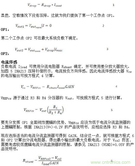 如圖 5 所示,用電流分流監(jiān)測器 INA213 測量電流可實施壓降補償。電壓輸出 Vcs 通過 Rm 反饋至轉(zhuǎn)換器的反饋電阻器網(wǎng)絡(luò)。轉(zhuǎn)換器塊 P1 說明了控制環(huán)路非常基本的原理。反饋 FB 好比參考電壓,而 Vout 通過致動器方案調(diào)節(jié),這里 FB 就是 VREF。因此,反饋電壓 FB 可視為恒定,而且等于轉(zhuǎn)換器的 VREF,其可用作所有計算的基礎(chǔ)。通過分流電阻器 Rs 的負載電流 Iload 的反向測量是應(yīng)用的關(guān)鍵。如果在負載電流 Iload 上升時要讓 Vout 上升,那么電流分流監(jiān)測器的輸出電壓 Vcs 就需要降低。在空載條件下 Vcs 是 VREF。如果負載提升,Vcs 會下降,而 Vout 則會相應(yīng)上升。這正是我們想要的結(jié)果。