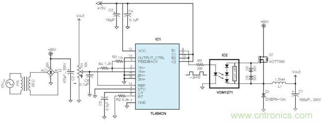 這里嘗試在開關(guān)穩(wěn)壓器中使用了光電耦合器(VOM1271),該耦合器具有一個(gè)內(nèi)置的快速關(guān)斷器件。如果將200pF柵極電容連接至IC2,則開關(guān)時(shí)間(ton與toff)分別為53μs和24μs。有鑒于此,降壓轉(zhuǎn)換器選擇了2kHz的開關(guān)頻率。此處選用了德州儀器(TI)的TL494(IC1)作為脈沖調(diào)制控制器。