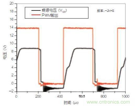 可以看到,盡管toff足夠快,但ton仍約為80μs。對于許多開關(guān)應(yīng)用來說,這個(gè)開啟過程是較慢的。若將開關(guān)頻率設(shè)置為2kHz,應(yīng)該不會導(dǎo)致太多開關(guān)損耗,對于PWM占空比較大的負(fù)載條件來說更是如此。